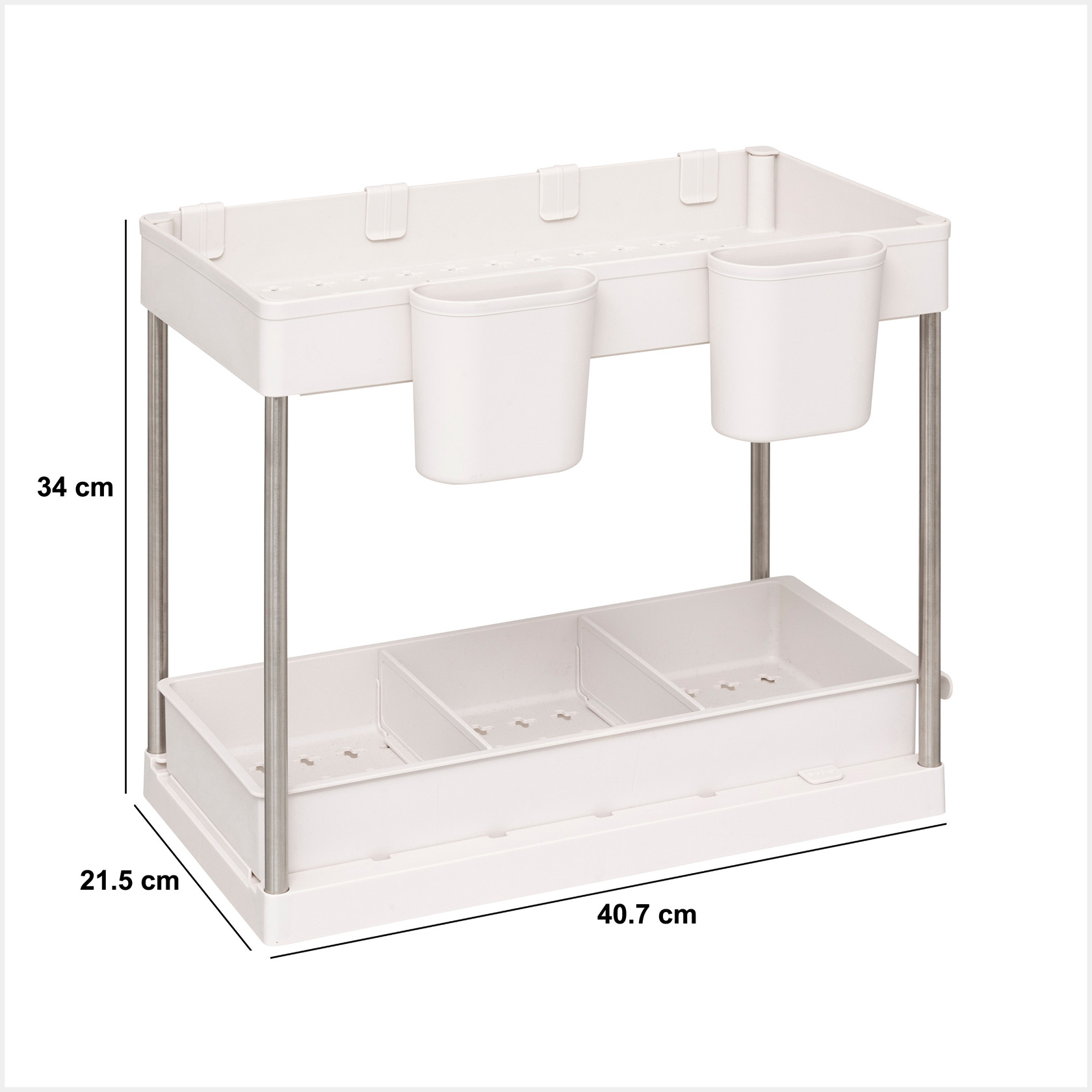 Schuifbare organizer: 2-laags uittrekbare kast organizer met schuiflade, haken en bakjes. Ideaal voor overzicht en extra ruimte in keuken of badkamer