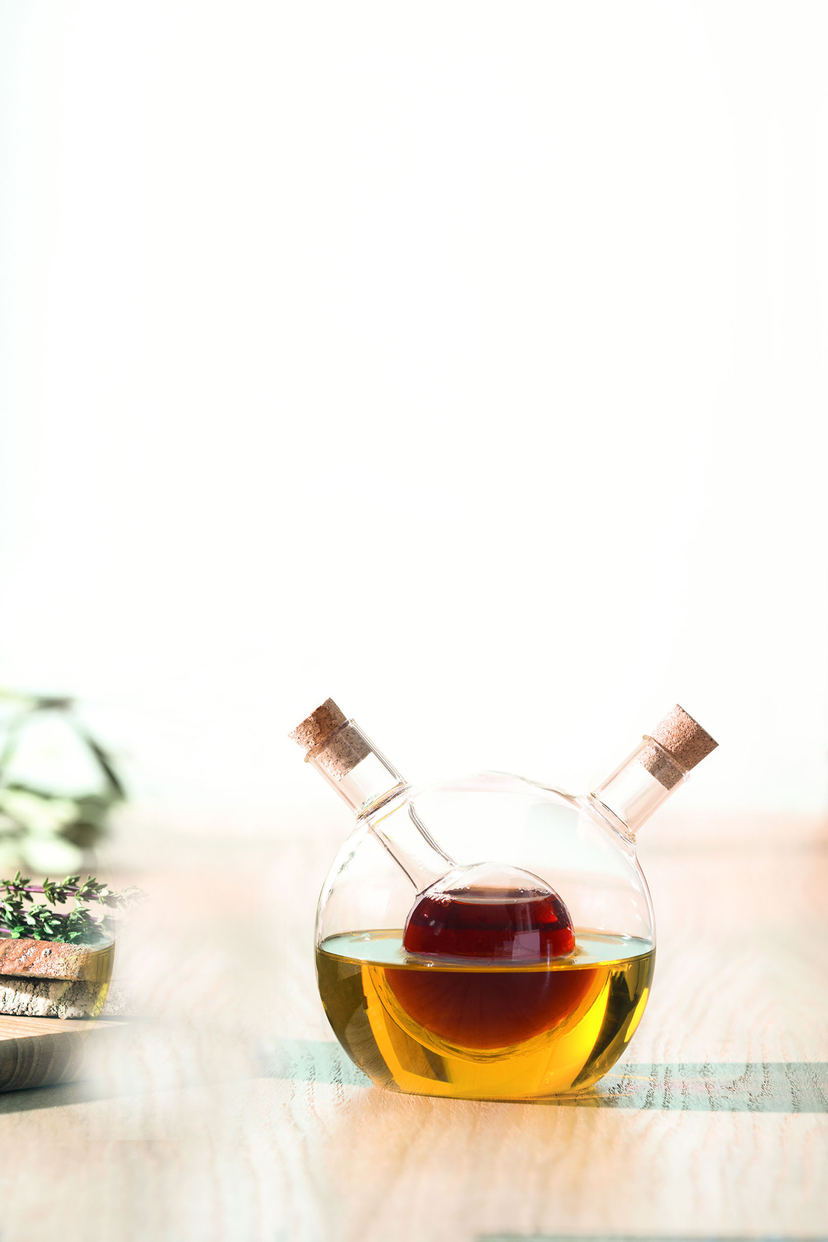 Unieke fles voor olie en azijn in de vorm van twee bolle glazen die met elkaar zijn verbonden. Doordat de flessen één geheel vormen, kun je het olie en azijn stel eenvoudig ruimtebesparend opbergen. Ideaal voor het bereiden van eten en het serveren van maaltijden op tafel. Dit design is een echte eyecatcher.