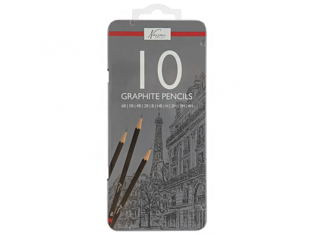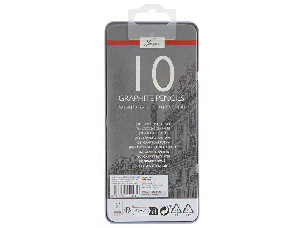 – 10 grafietpotloden in verschillende hardheden: 6B, 5B, 4B, 2B, B, HB, H, 2H, 3H, 4H