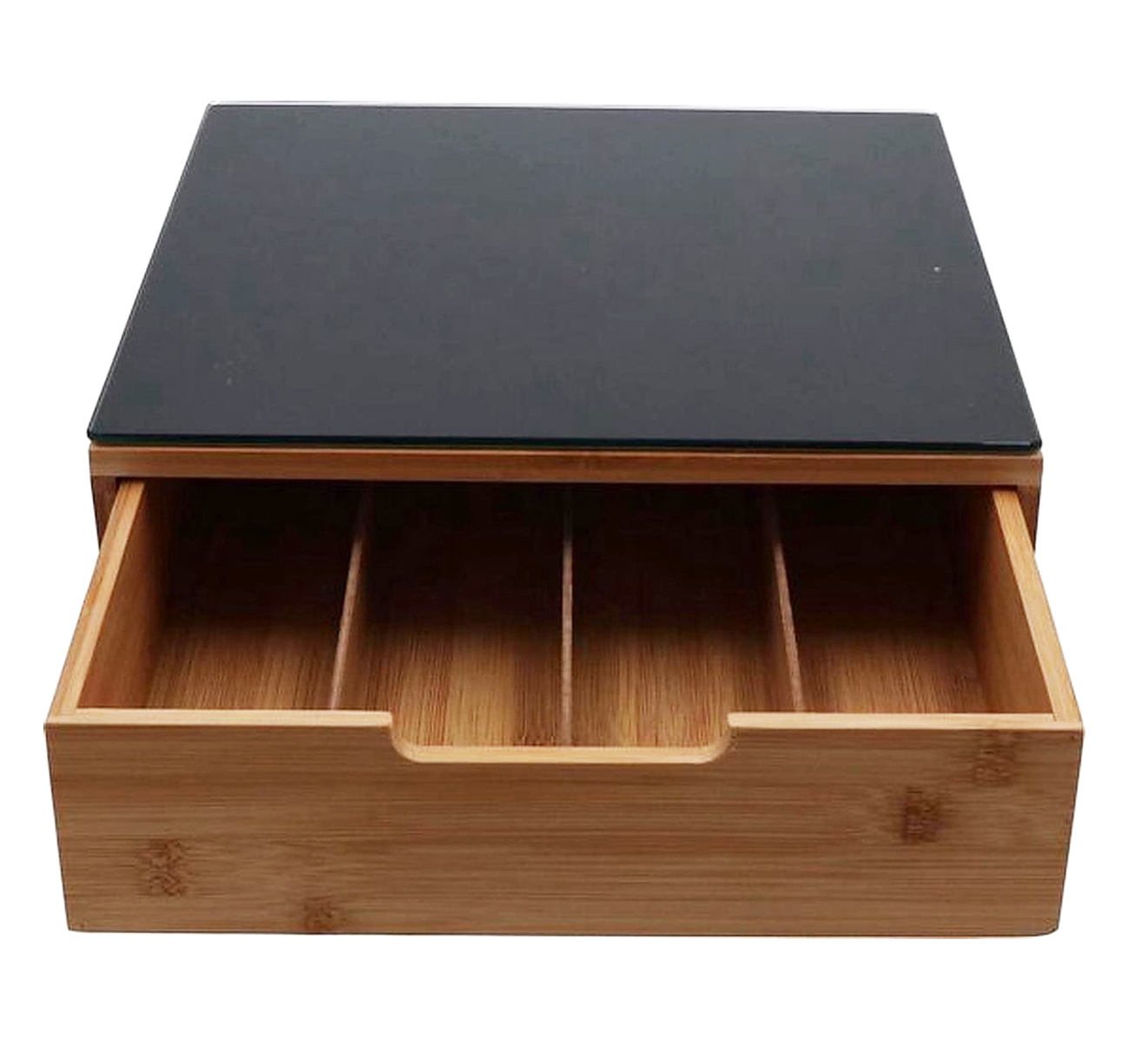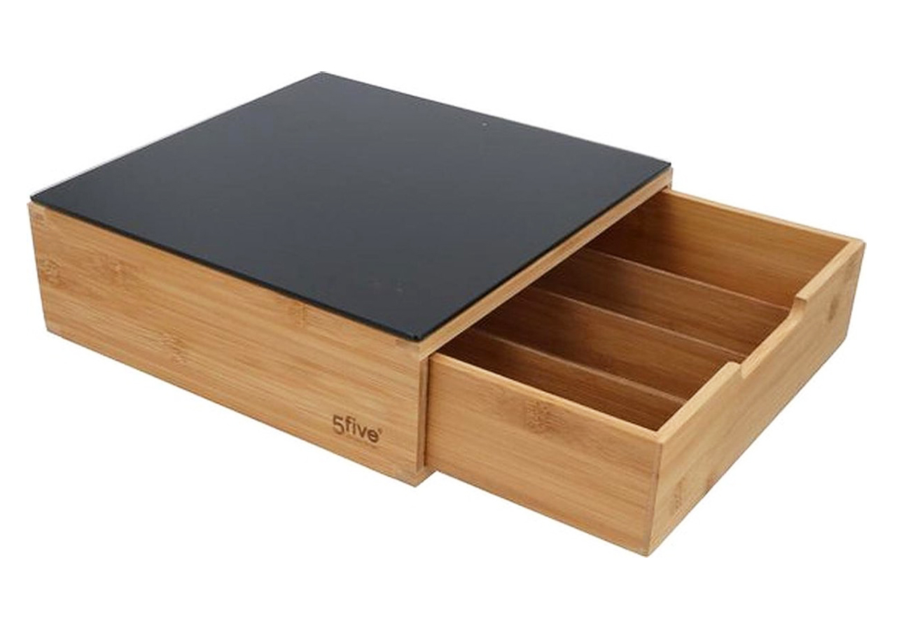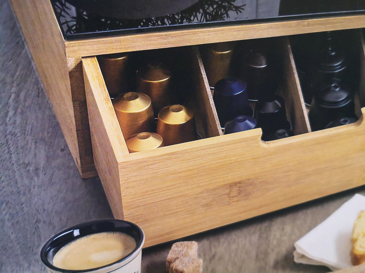 Bamboe is erg stevig materiaal en het is ideaal om onder het koffiezetapparaat te plaatsen. De lade voor de koffiecups is verdeeld in vier vakken, afhankelijk van je koffiezetapparaat kan je er het volgende in kwijt: