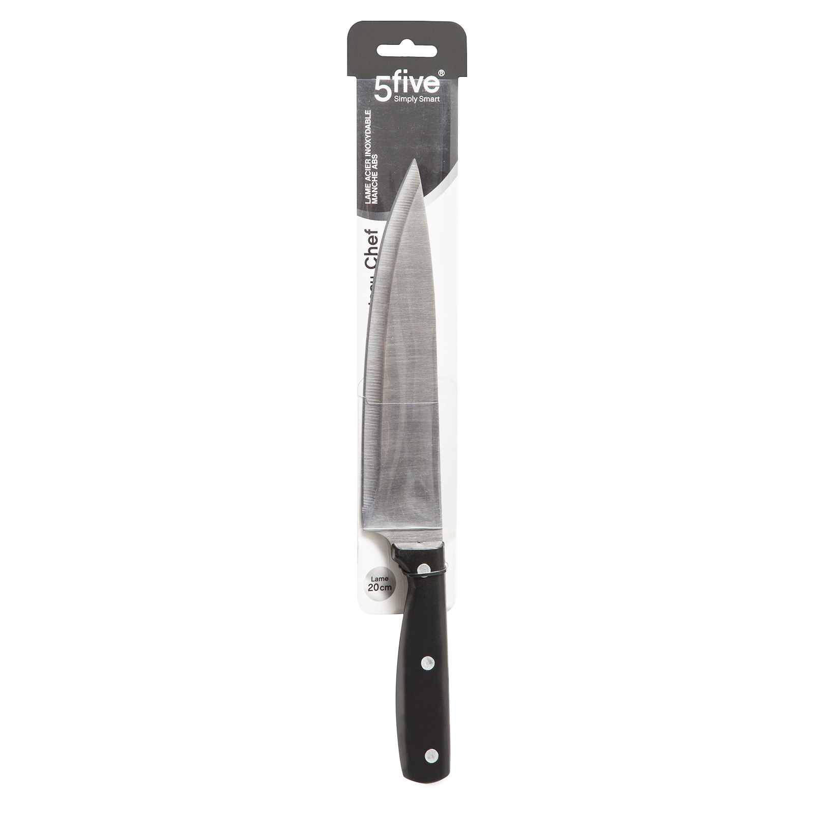 – Een “full tang” koksmes, waarbij de staal volledig doorloopt tot het einde van het handvat. Beide kanten van de handvat zijn beschermd met ABS kunststof en vastgezet met stevige rivetten.