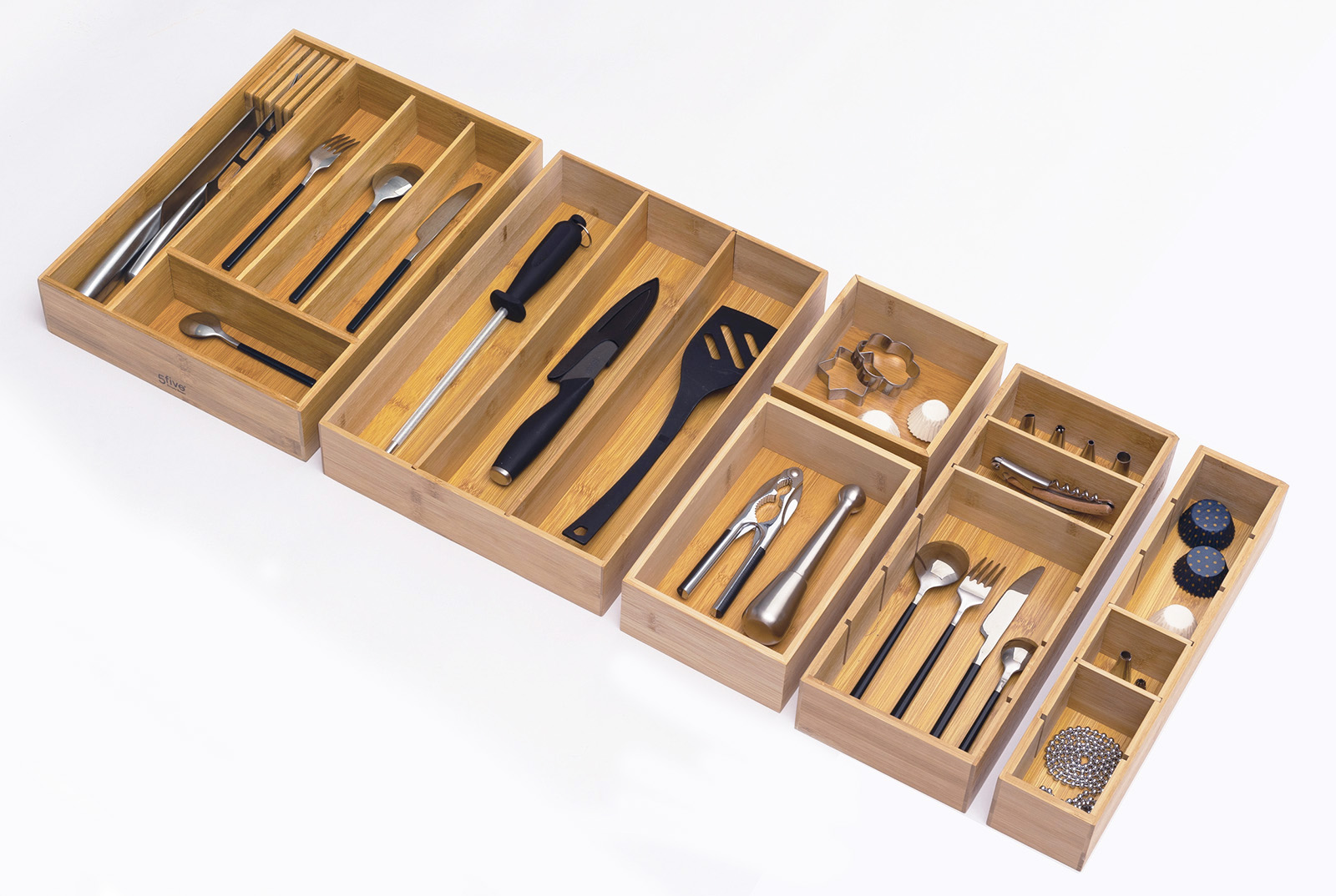 Met de zes verschillende bamboe bakjes van Five® kun je een praktische lade indeling maken. Door dezelfde hoogte kun je alle varianten combineren en een eigen indeling naar keuze maken. Organiseer met de lade bakjes een keukenlade door messen, pollepels en ander keukengerei te sorteren. Of kies ervoor om je make-up in de badkamerlade te organiseren. Door de grote diepte van de houten bakjes passen zelfs grote oogschaduw paletten in de ladebakjes.