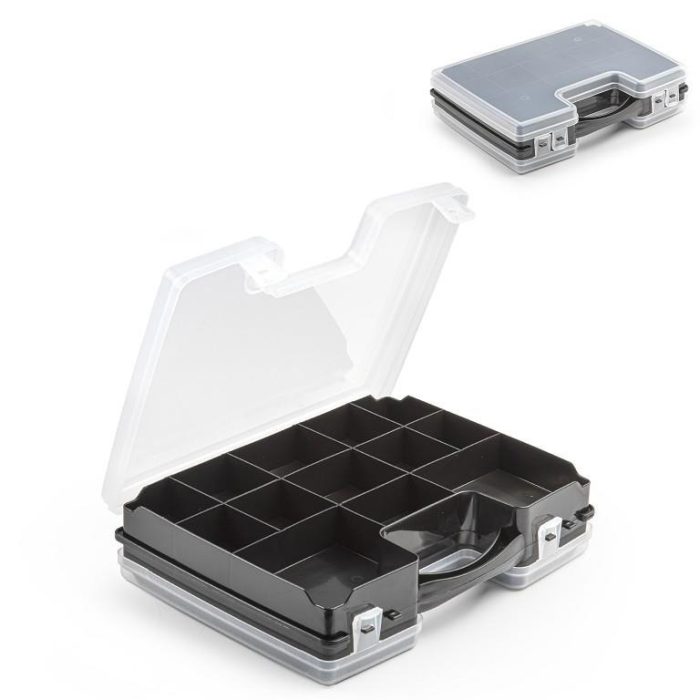 Multifunctionele en praktische dubbelzijdige opbergkoffer gemaakt van hoogwaardige kunststof. Deze opbergkoffer bevat 2 kanten met vaste sorteervakken aan elke kant (13 aan bovenkant en 8 aan onderkant). In totaal heeft het 21 opbergvakken. Handig om kleine accessoires of onderdelen zoals kralen, medicijnen, hobby accessoires, schroeven, sieraden, naai accessoires en nog veel meer te ordenen. Ook handig te gebruiken als een gereedschap doos.