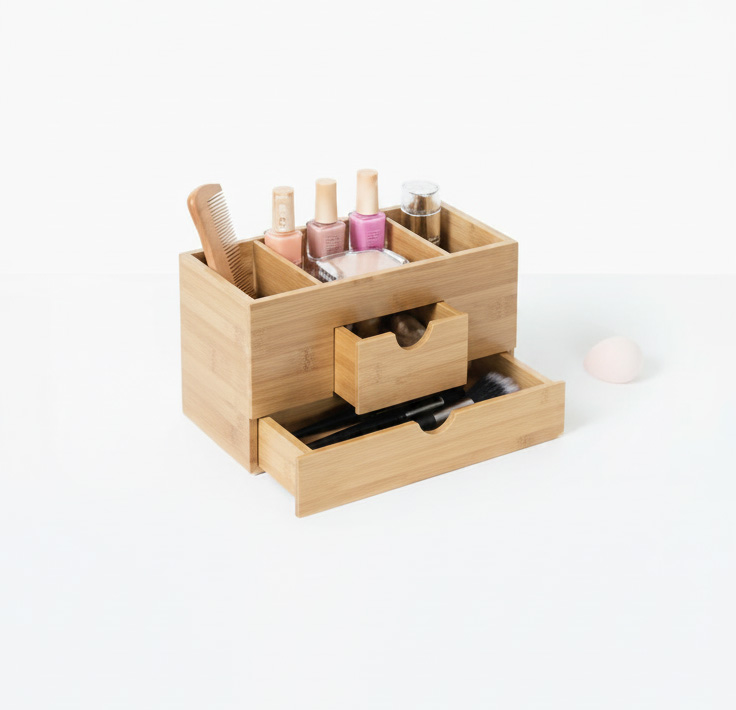Compacte bamboe organizer met twee lades en vakken, ideaal voor het netjes opbergen van make-up, accessoires en kleine spullen