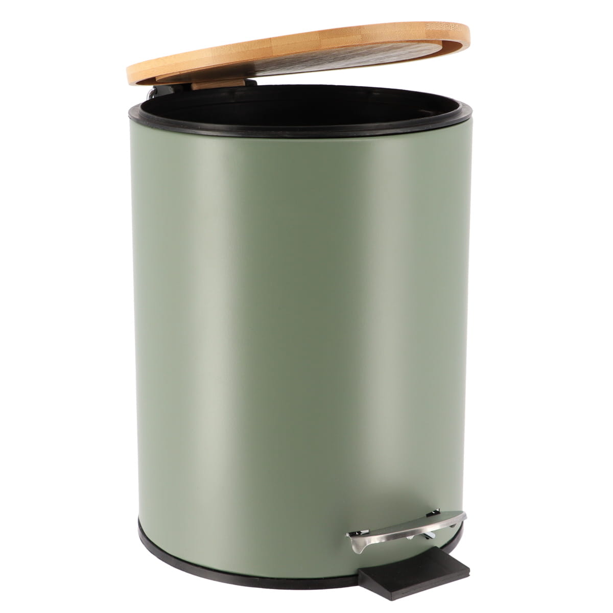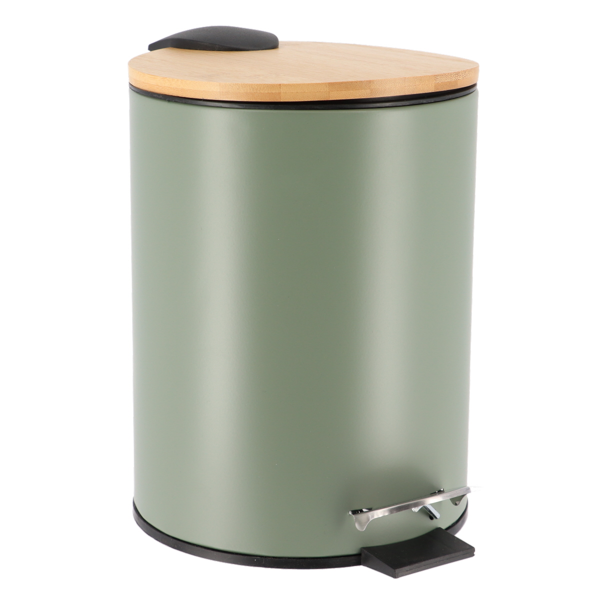 Een compacte maar stijlvolle pedaalemmer voor in kleine ruimtes zoals badkamer, toilet, slaapkamer, keuken en kantoor. Dankzij het kleine formaat neemt deze metalen pedaalemmer niet veel ruimte in beslag. De combinatie van bamboe met kaki groen materiaal geeft een luxe en natuurlijke uitstraling.