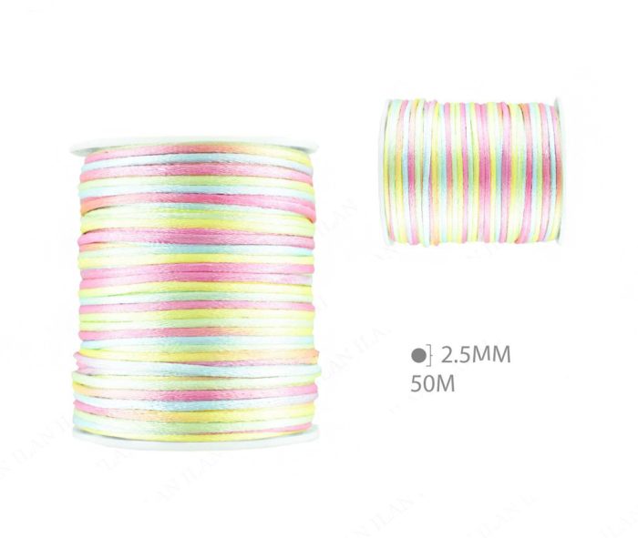 Dit satijnen koord van 2,5 mm dikte heeft een luxe glans en een heerlijk zachte textuur. Met een lengte van 50 meter en beschikbaar in varianten met prachtig kleurverloop in frisse, vrolijke tinten, is het perfect voor het maken van sieraden, het knopen van armbandjes en diverse andere decoratieve projecten. Dit koord is een favoriet onder zowel hobbyisten als professionals vanwege zijn veelzijdigheid en stijlvolle afwerking.