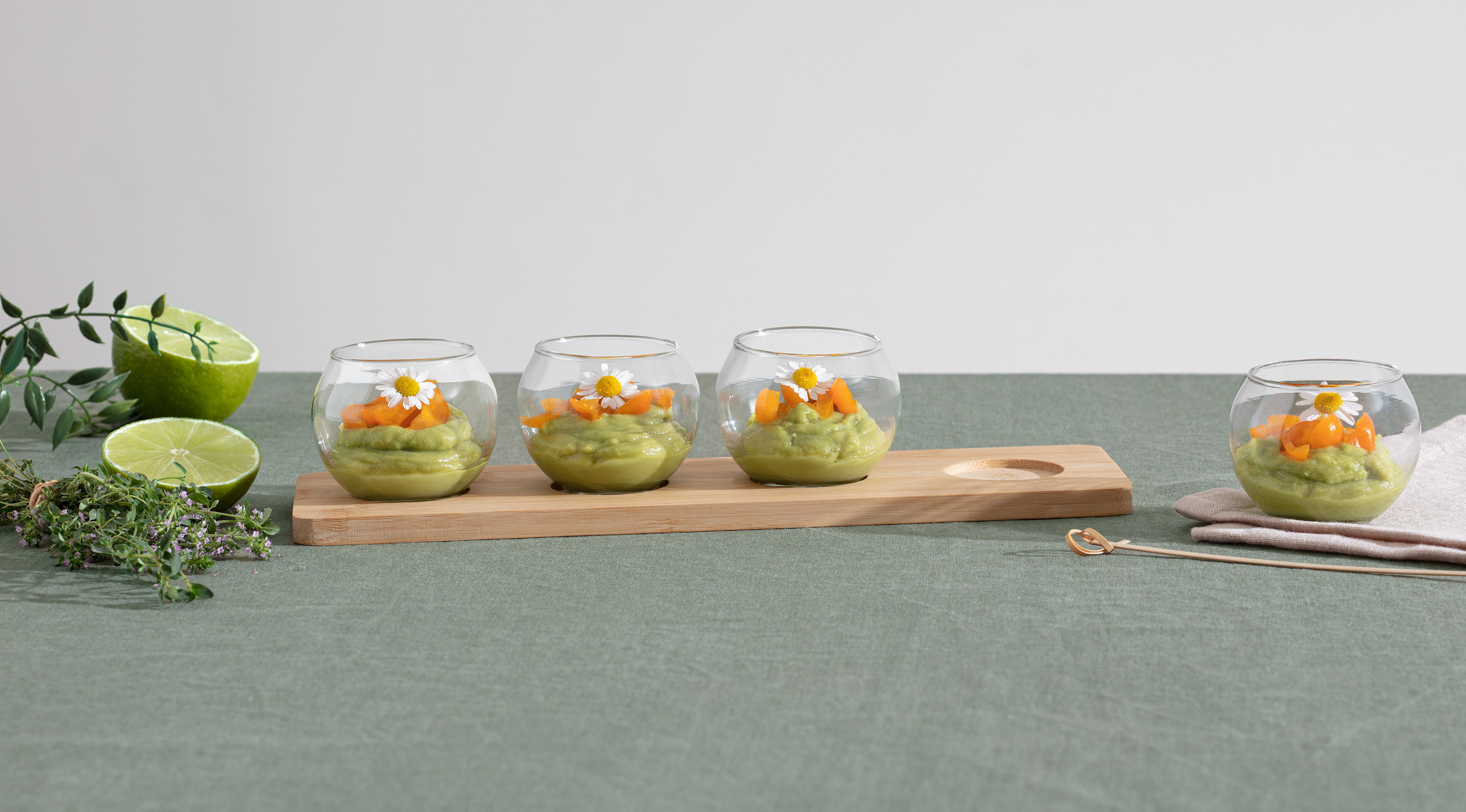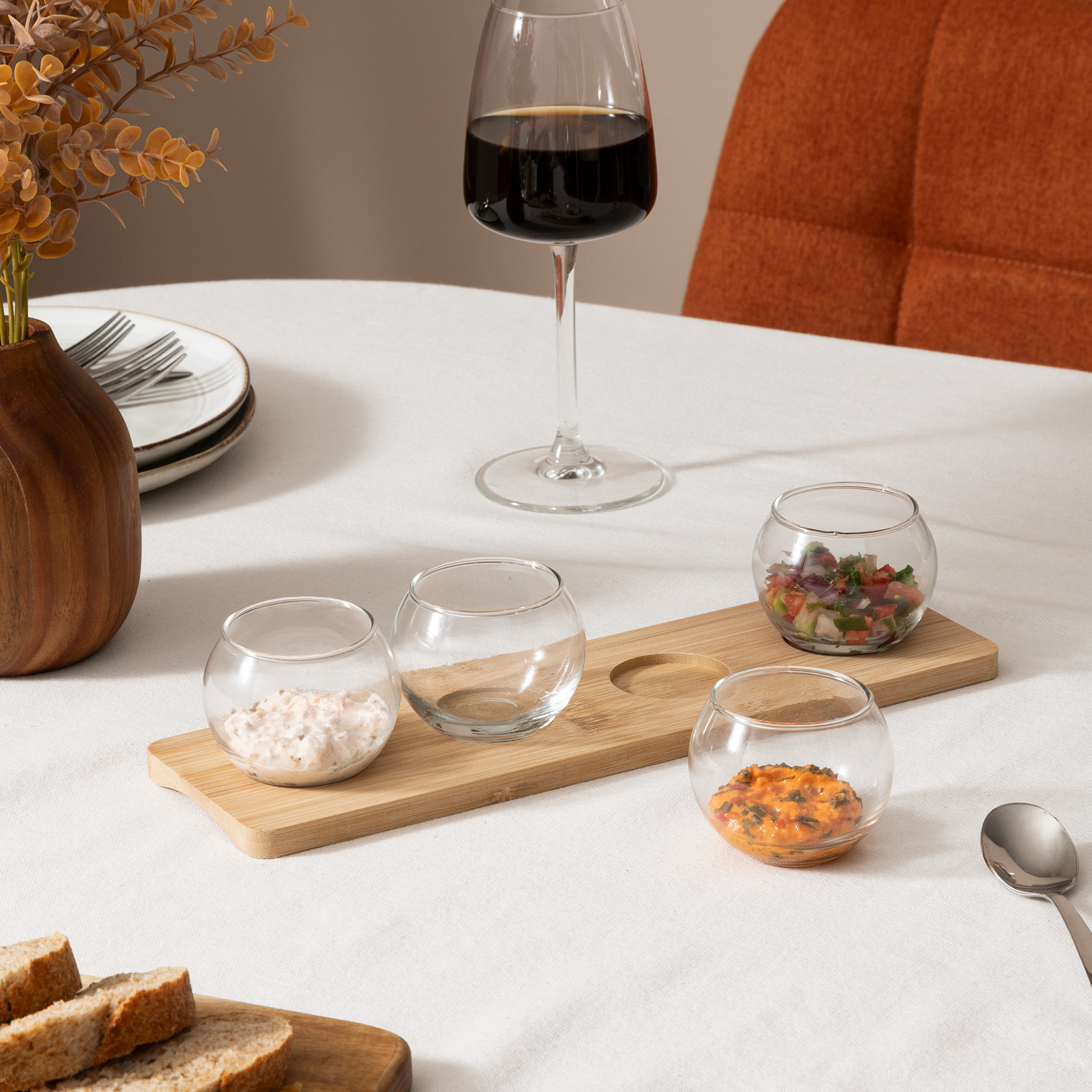 Dit is een stijlvolle en moderne degustatieservies set, ideaal voor het serveren van snacks en aperitieven. De transparante schaaltjes staan op een elegant bamboe dienblad, wat een natuurlijke en warme uitstraling geeft aan de set. Deze combinatie van patronen en materialen maakt de set niet alleen praktisch, maar ook een mooie toevoeging aan de tafel bij het serveren van hapjes of dips.