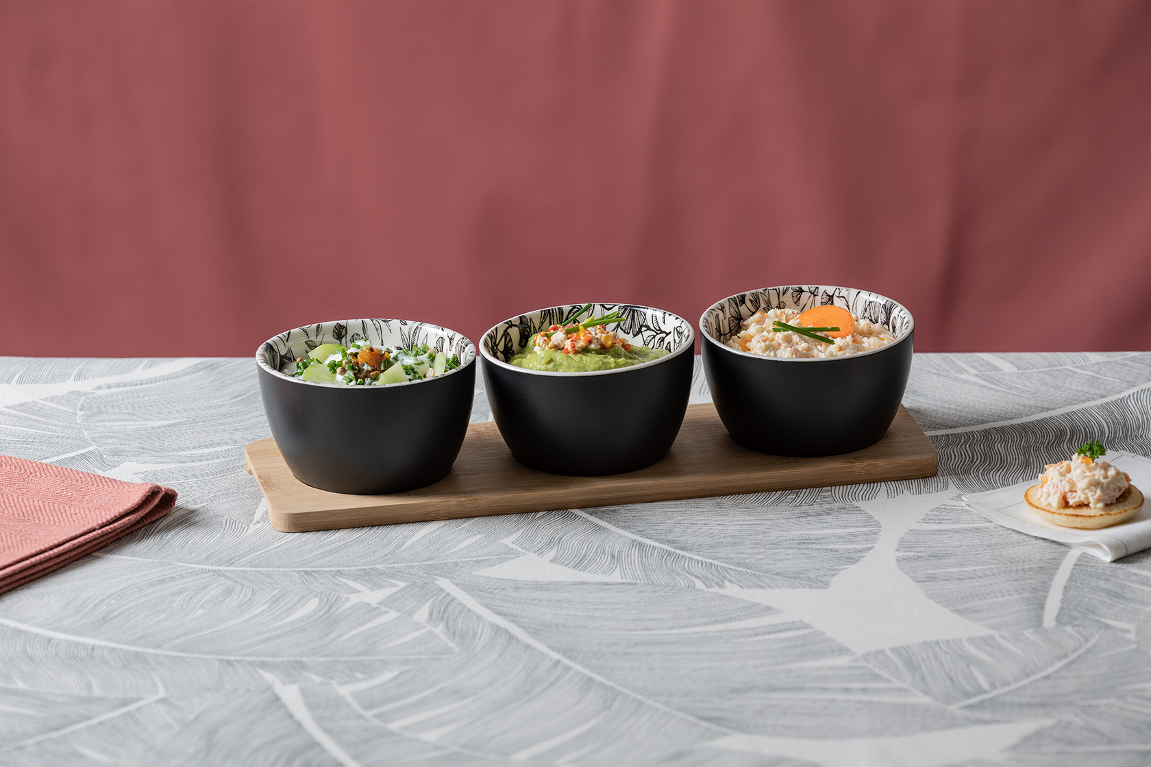 Dit is een stijlvolle en moderne degustatieservies set, ideaal voor het serveren van snacks, hapjes, aperitieven, dips of kleine bijgerechten. De buitenkant van de schaaltjes is uitgevoerd in een strak zwart design, terwijl de binnenkant is versierd met een elegant botanisch patroon in zwart-wit. Dit contrast zorgt voor een moderne en opvallende uitstraling, perfect voor elke tafelsetting.Deze combinatie van patronen en materialen maakt de set niet alleen praktisch, maar ook een mooie toevoeging aan de tafel bij het serveren van hapjes of dips.