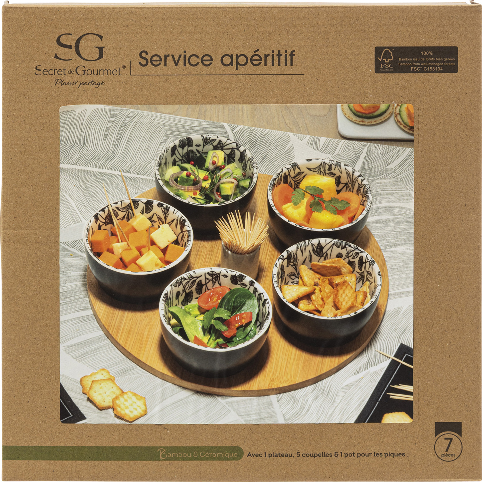 Verpakkingsinhoud: 1 bamboe plateau, 5 ramekins/ schalen, 1 pak tandenstokers, 1 tandenstokerhouder