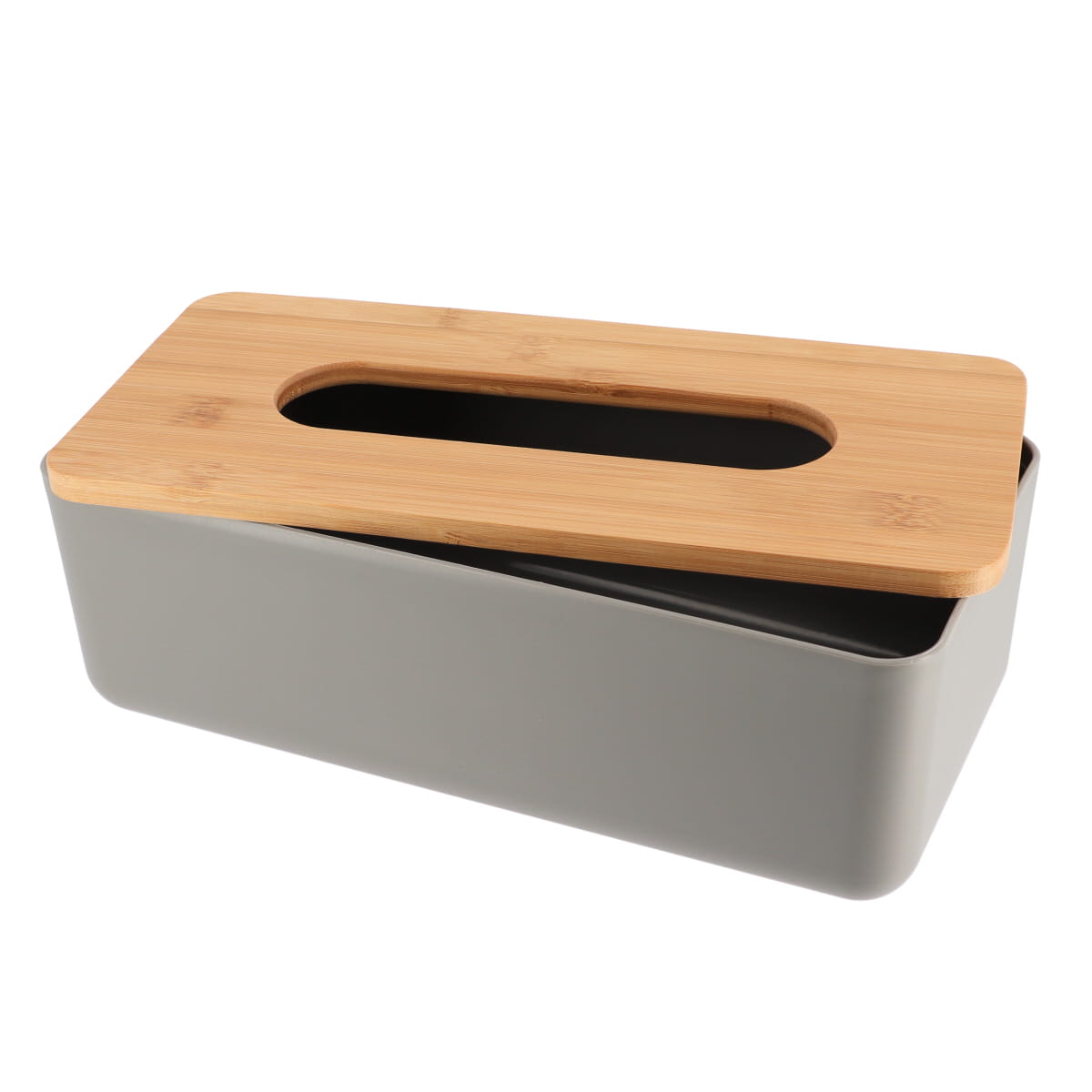 De combinatie van grijze doos met bamboe deksel geeft een luxe uitstraling. Geschikt voor zowel zakdoekdozen als losse zakdoeken.