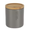 Stijlvolle wattenpot van polyresin met bamboe deksel in grijs naturel, ideaal voor watjes en kleine accessoires in een opgeruimde badkamer