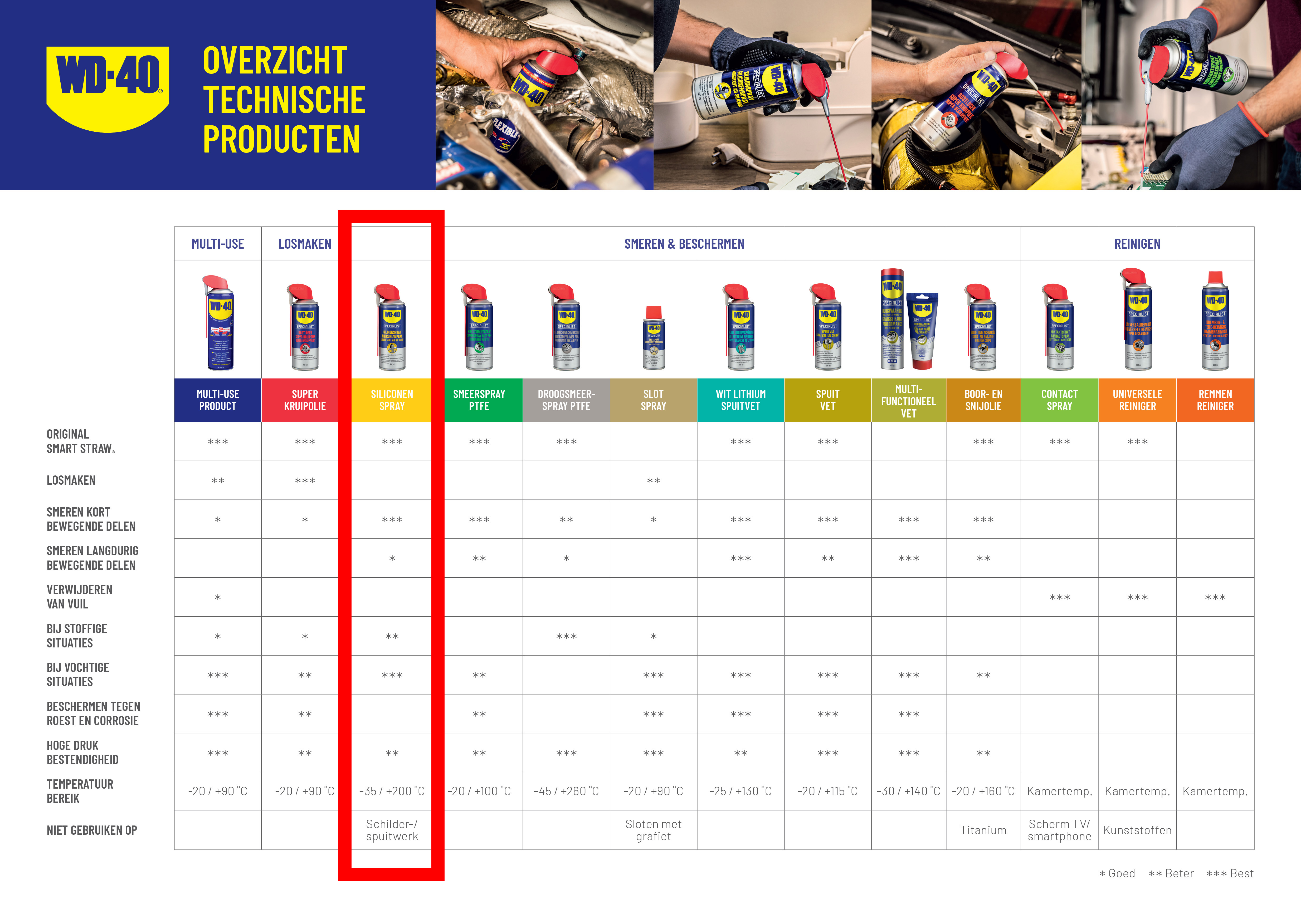 WD-40 SPECIALIST® SILICONENSPRAY Beschermt afdichtingen tegen vocht, maakt waterafstotend en zorgt voor een uitstekende smering. De spr6ay verlengt de levensduur van bijvoorbeeld gereedschap, apparatuur, kunststoffen en rubbers. Ook verbetert het de werking van lagers, sloten, takels en geleiders. Ook geschikt in erg vochtige omstandigheden.