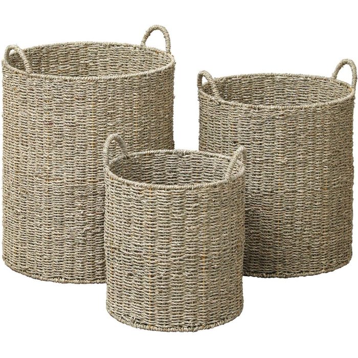 Deze zeegras manden met handvatten vormen een veelzijdige en stijlvolle opbergoplossing. Het zeegras biedt duurzaamheid en een natuurlijke uitstraling. Met verschillende formaten in één set zijn deze manden perfect voor het organiseren van diverse items, terwijl de handvatten zorgen voor eenvoudig verplaatsen.