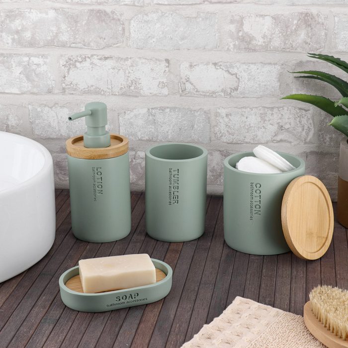 Stijlvolle Eucalyptus-groene zeepdispenser van polyresin met bamboe detail, 280ml inhoud, ideaal voor een rustige, moderne en natuurlijke badkamerstijl
