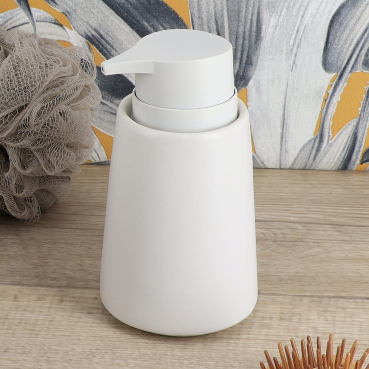 De witte zeepdispenser met een strakke conische vorm en een inhoud van 420 ml is vervaardigd van stoneware, die duurzaamheid en een moderne uitstraling garandeert. Het minimalistische ontwerp en de witte kleur voegen een eigentijds element toe aan de badkamer of keuken.