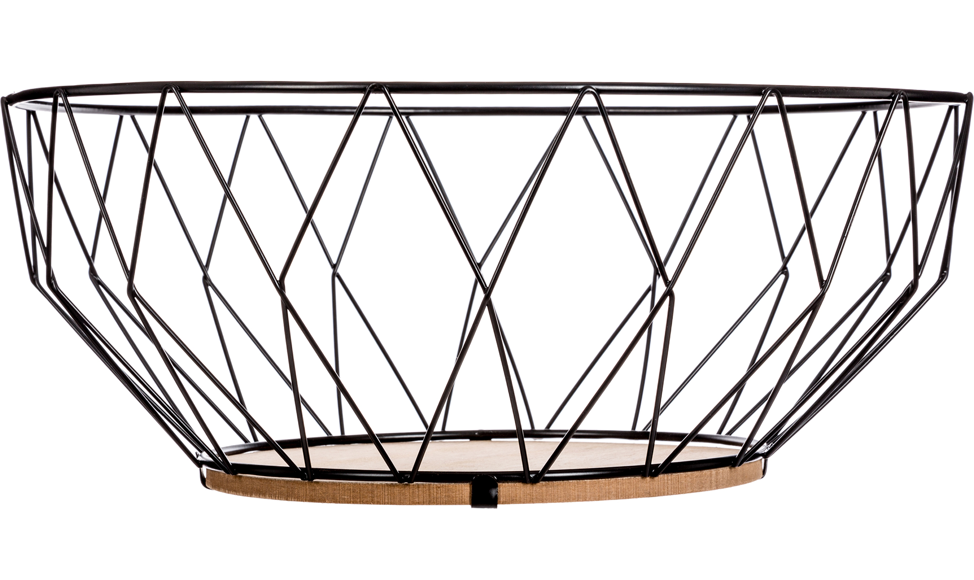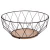 – De fruitschaal heeft een houten bodem en de mand is in zwart metaal .
